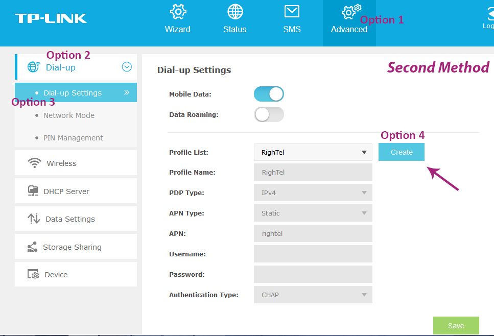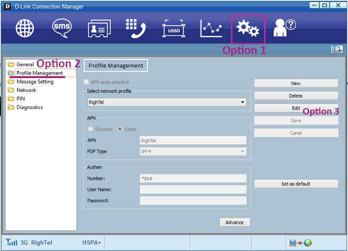 In this method, first click on the Advanced option (option 1), then select the Dial-up menu (Option 2) under the Dial-up Setting menu (Option 3).