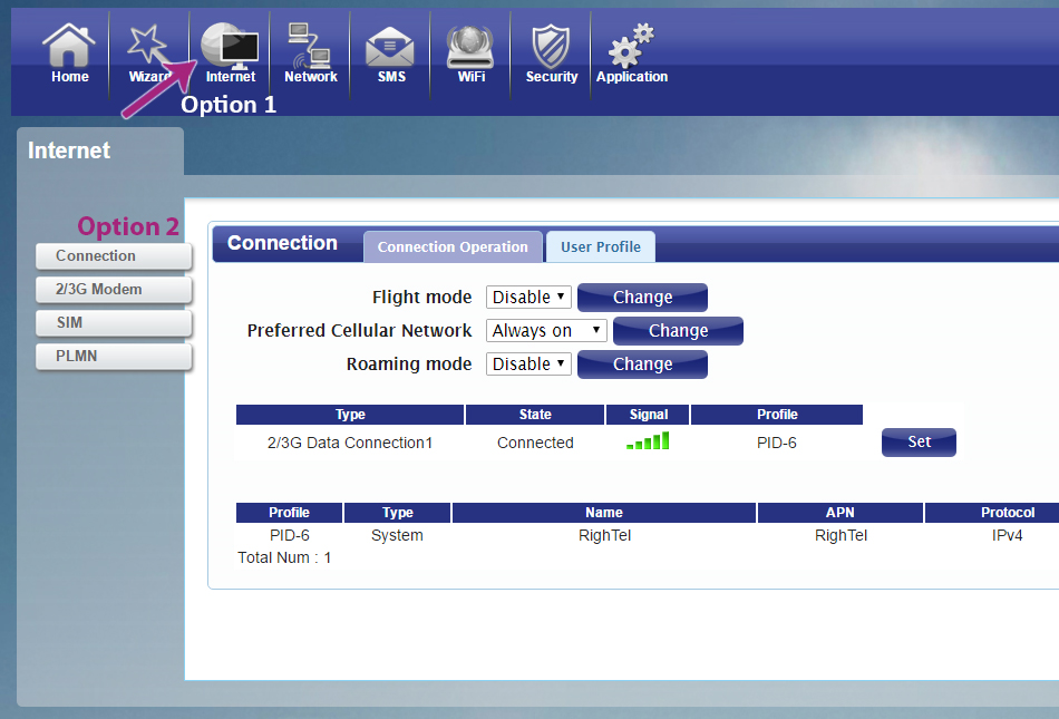 Click on the Internet option (Option 1), then select Connection (Option 2) and finally click on the User Profile option (Option 3).