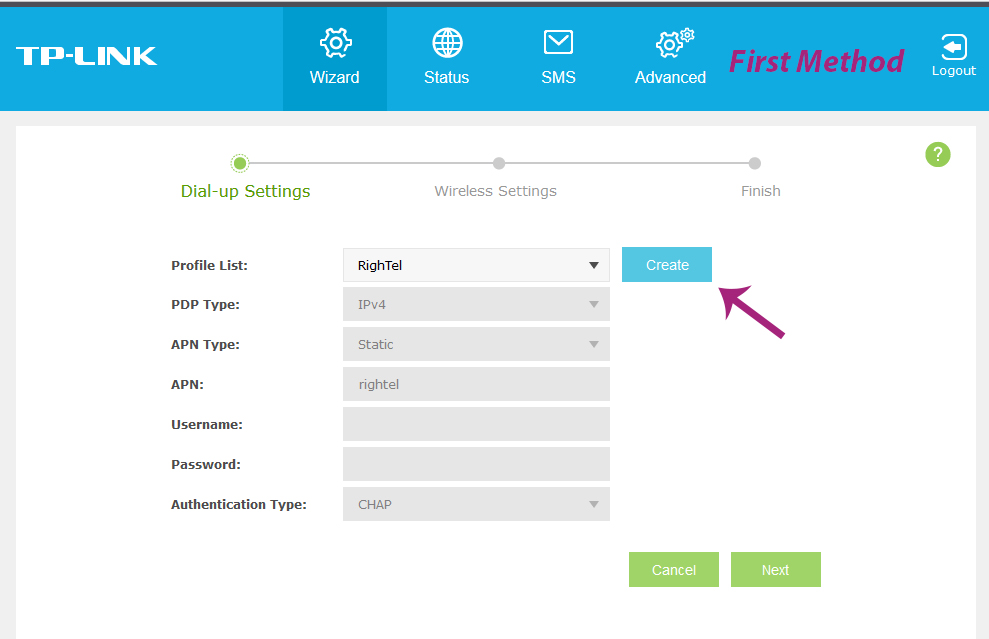 In order to activate and use IPv6 on the router modem of the TP-Link Archer MR200, you must follow the steps below. To apply the desired settings in the home page, click on the advanced option, in the opened page, click on the Internet menu, and then click on the Create Profile link at the bottom of the page.