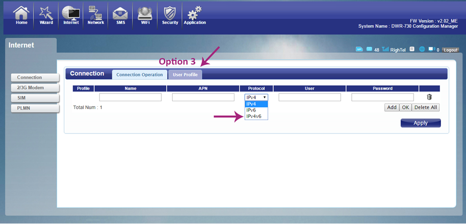It should be noted that in this type of modem, between IPv4 and IPv6 protocols, you can only select an option (Option 5).