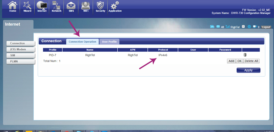 After applying the required settings, click on the Apply option. As you can see in the screenshot below, you can see the settings done on the modem by clicking on the Connection Operation tab. After rebooting the device, you will be able to use IPv6.
