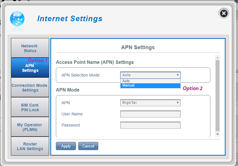 Click the Internet option first, then select the APN Settings menu (Option 1), then select the Manual option under Option 2 under the APN Selection Mode menu.