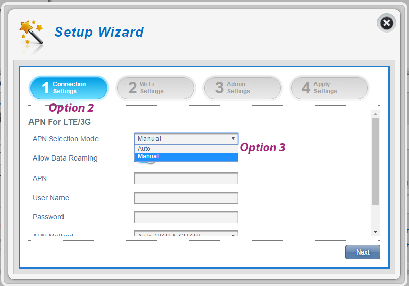 Then in the Connection Setting menu (Option 2), select the Manual option under the APN Selection Mode menu.