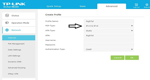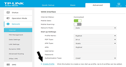In order to activate and use IPv6 on the router modem of the TP-Link Archer MR200, you must follow the steps below. To apply the desired settings in the home page, click on the advanced option, in the opened page, click on the Internet menu, and then click on the Create Profile link at the bottom of the page.