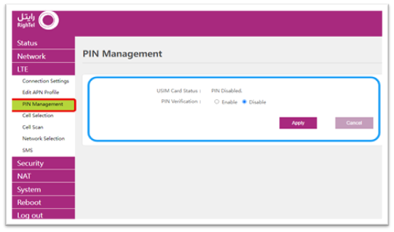 در قسمت Edit PIN Management با انتخاب گزینه Enable، امکان تعریف پینکد جدید سیمکارت وجود دارد. در صورت تغییر یا ویرایش پینکد سیمکارت، گزینه Enable را انتخاب و در قسمت Input PIN پینکد جدید سیمکارت را درج و سپس گزینه «Apply» را انتخاب کنید. در غیر اینصورت قسمت مذکور خالی میماند تا سیمکارت بهصورت خودکار وصل شود. پیشنهاد میشود این بخش همواره در حالت Disable قرار بگیرد.